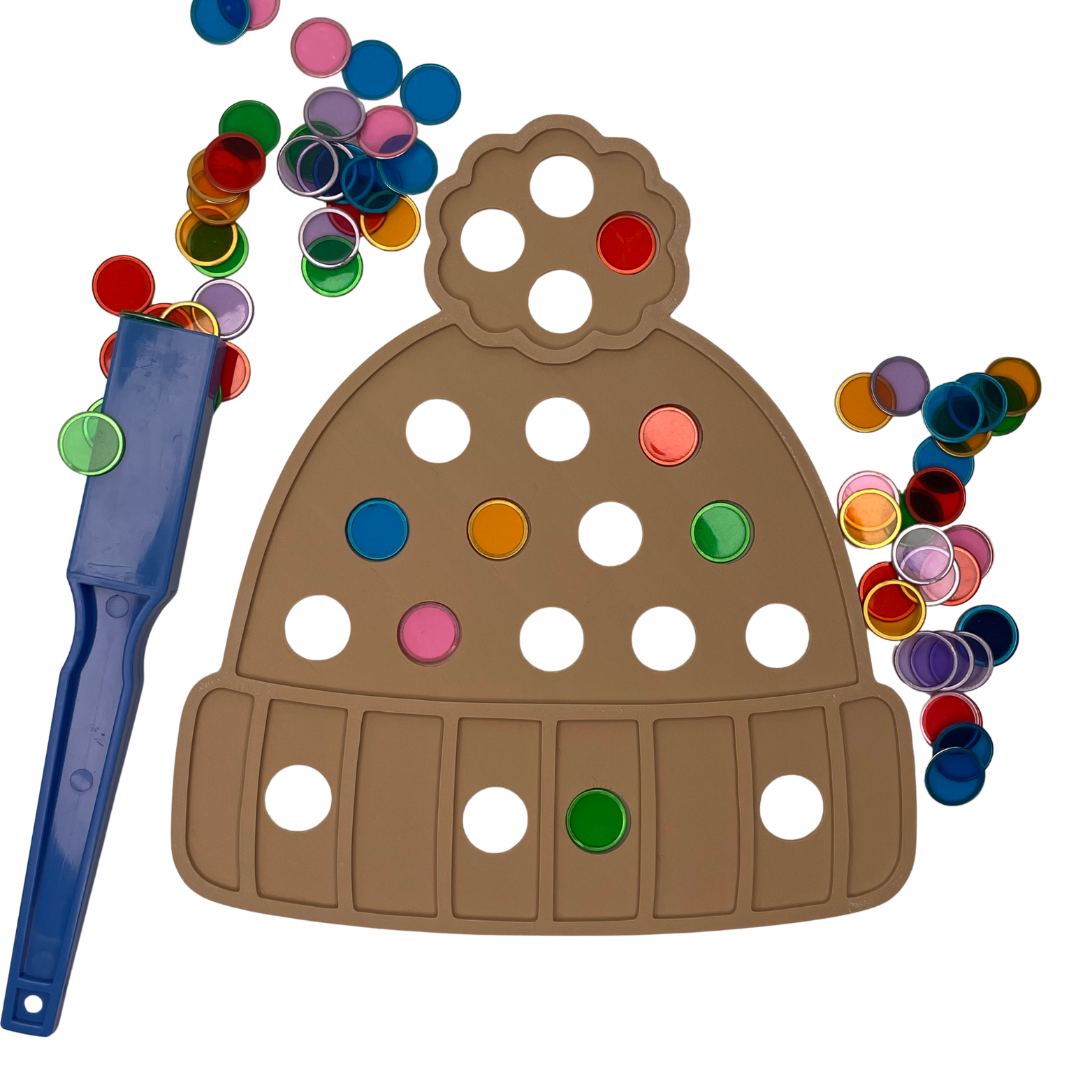 Deze vrolijke muts is ideaal om fijne motoriek, ruimtelijke oriëntatie en concentratie te oefenen. Kinderen plaatsen magnetische bingo-fiches in de gaatjes op basis van een opdrachtkaart. Zo trainen ze kijken, vergelijken en nauwkeurig plaatsen op een speelse en aantrekkelijke manier.